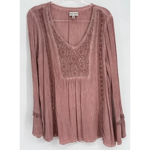 Knox Rose Womens Dusty Rose Embroidered Lace Trim Boho Bell Sleeve Blouse Sz L