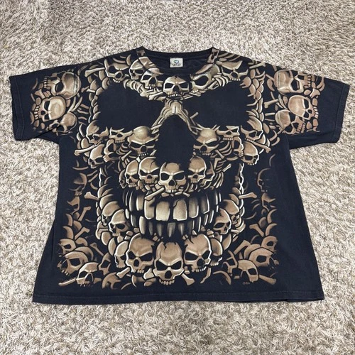 Vintage Y2K 2006 Mens Liquid Blue AOP Skull Crossbones Skeleton Shirt Size Large