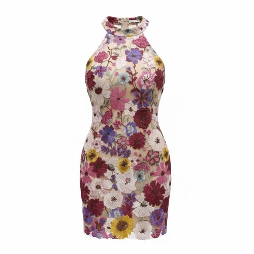 3D Floral Embroidered Halter Mini Dress Coquette Romantic Body Skimming Size M
