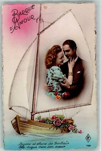 39781455 - Woman Pair Roses Saying Barque D Amour PF No.792 Sailboat