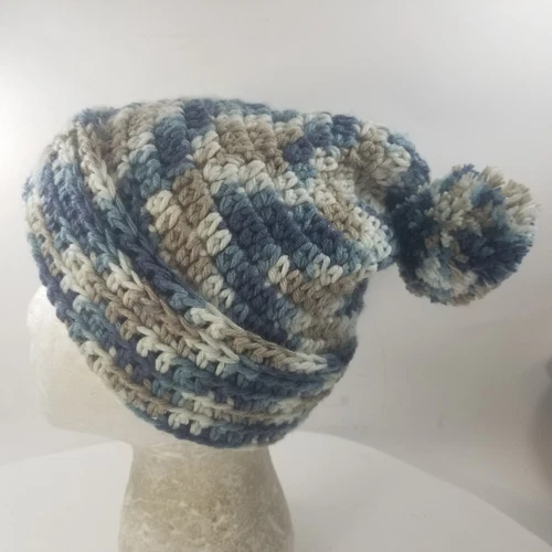 Blue Beanie Slouch Pom Cuff Ladies Handmade Crochet Hat Cap Winter Warm