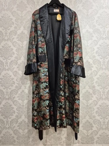 Vintage Longevity Hangzhou China Silk Brocade Robe Smoking Jacket Pagoda NOS