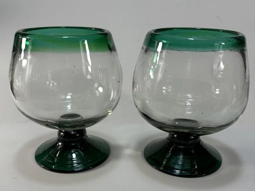 2 Handblown MEXTEQUIL Mexican Glass Green Rim Snifter Tequila Small Tasting