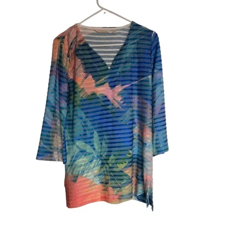 Soft Surroundings Womens Medium Blue Green Coral Layered Textured Floral Top