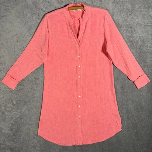 Soft Surroundings Coral Pink Cotton Gauze Tunic Button Down Shirt Dress Coastal