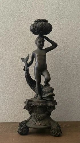 Boy Statue Candle Holder Bronze Putti and Dragon Fish 17"
