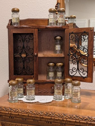 Vintage Wood Wall Spice Cabinet Rack 12 Labeled Glass Jars 2 Drawers