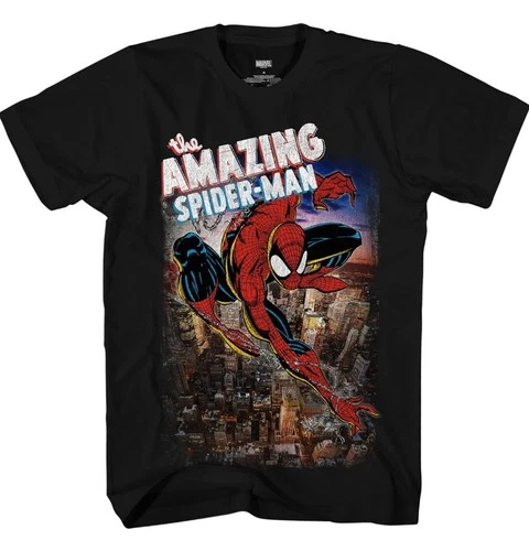 Spider-Man New Adult T-Shirt - Amazing Flying Above the City Below-2XL