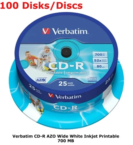 100 x Verbatim Blank CD-R 52x White CD Printable 700MB 80Mins Discs in Spindle