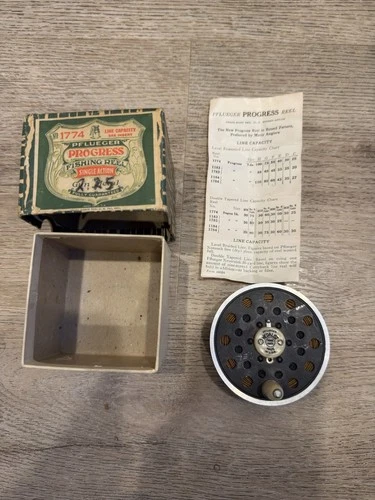 VINTAGE PFLUEGER PROGRESS No. 1774 FISHING REEL GUN METAL WITH ORIGINAL BOX. Q11