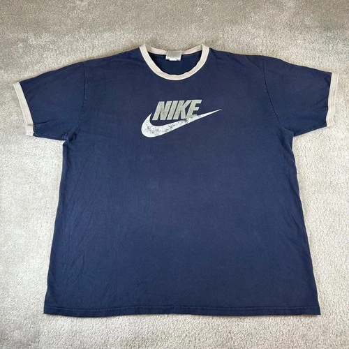 Vintage Y2K Nike Ringer T-Shirt Men's XL Navy Blue Distressed Logo Graphic Tee