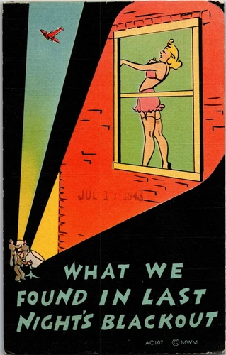 WWII Army Comic Girl in Undies, Last Night's Blackout Spotlight Postcard F28