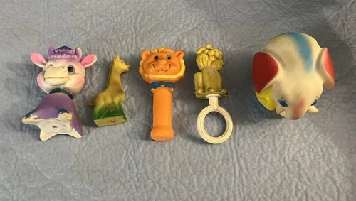 Vintage Baby squeaky toys Lot of 5-Cow, Lion, Lion, Elephant, Giraffe 1950-70's