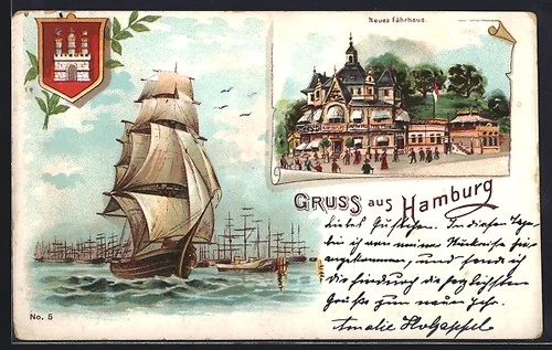 Lithograph Hamburg, Gasthof St. Pauli ferry house, sailing ship in motion 1901