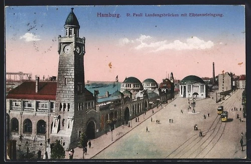 Postcard Hamburg-St. Pauli, St. Pauli Landungsbrücken with Elbe tunnel entrance and road
