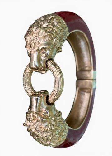 CHANEL 2011 Lion Head Cuff Bracelet CC Logo Burgundy Enamel Bangle Gold Leo Rare