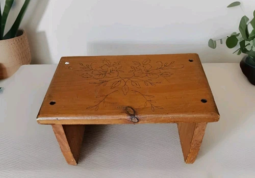 Vintage Handcrafted Wooden Childrens Step Stool Plant Stand Carved Flowers