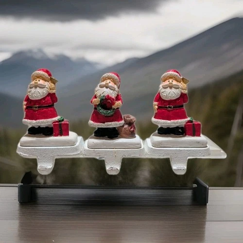 Santa Figures/Cast Iron/Set Of 3/Small/Stocking Hanger/Red/Bells/Reath/4" Length