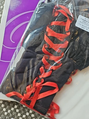 Figleaves Black Red Ribbon Hold Up Stockings Size M