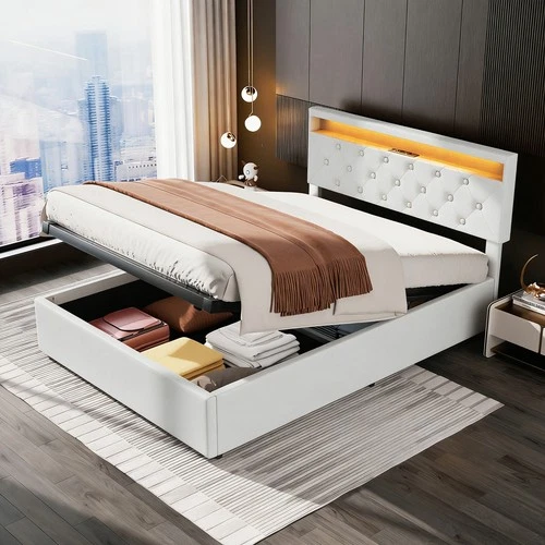 NEW LED OTTOMAN STORAGE PANEL WHITE PU LEATHER UPHOLSTERED BED FRAME DOUBLE Fygh