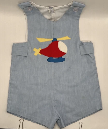 Vtg Seersucker Romper Shortall Helicopter Embroidered Applique Pocket 4T