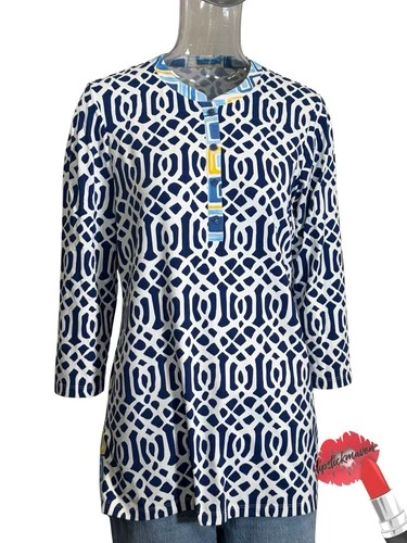 J McLaughlin Tunic Top Medium Blue Geometric Shirt Coastal Beach Resort