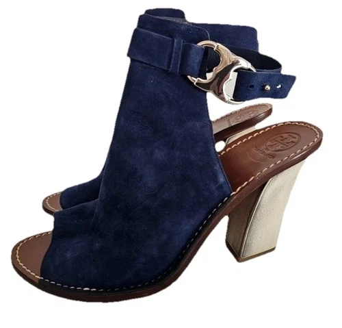TORY BURCH Gemini Link Open-Toe Navy Blue Suede Sandal Booties Womens Size 6