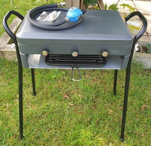 CAMPING STOVE TWIN BURNER & GRILL PROPANE/BUTANE Inc regulator & hose & Bag LEGS