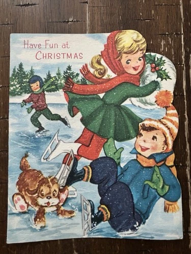 VTG Sunshine Christmas Card Die Cut Skating Kids & Puppy Coloring Card