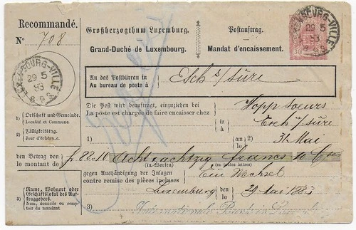 Luxembourg Esch s. Sure, Ettelbruck, 1883 Postal Order - International Bank