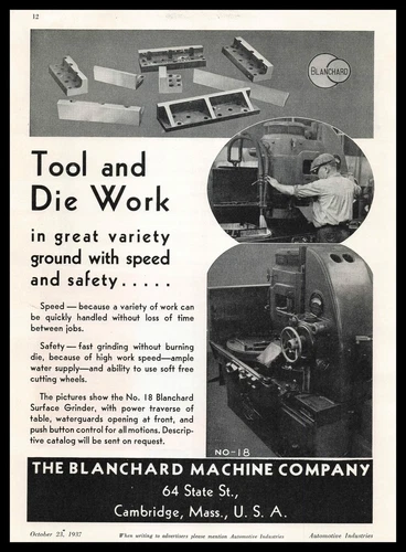 1937 Blanchard No. 18 Surface Grinder Machine Cambridge Massachusetts Print Ad