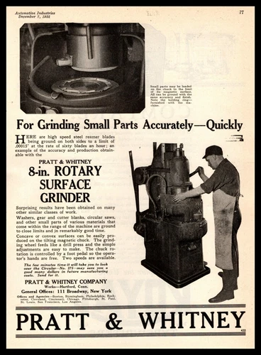 1922 Pratt & Whitney New York 8" Rotary Surface Grinder Photo Vintage Print Ad