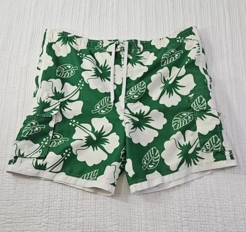 Faded Glory Board Swim Trunks Men's L (36-38) Green Tropical Drawstring Pockets