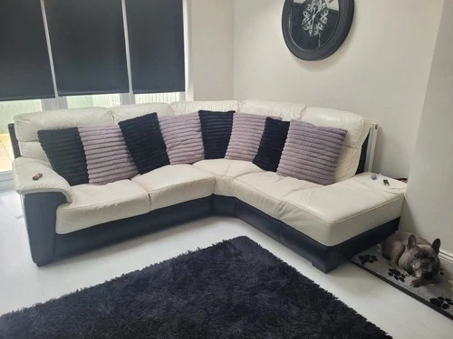 DFS Leather Corner Sofa, Swivel Two Seat 'Cuddle' Chair & half moon footstool