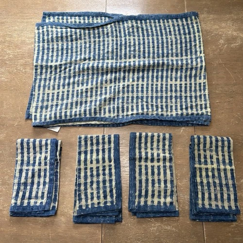 Williams Sonoma Blue Striped Table Runner & 4 Napkin Set Cotton/Linen Coastal VG