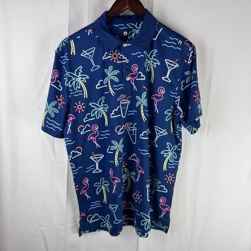 Chubbies Polo Shirt Mens Medium Blue Neon Palm Flamingo Cocktail Tropical Party