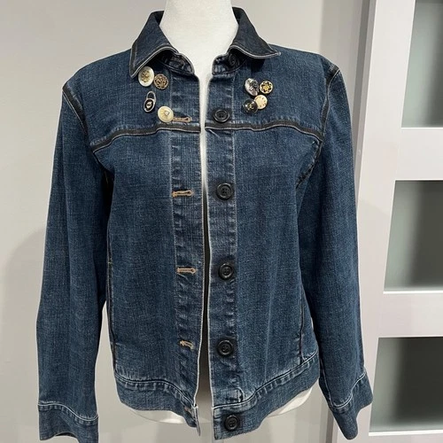 Upcycled Ann Taylor Petites Denim Jacket Embellished Buttons Hand Painted Face