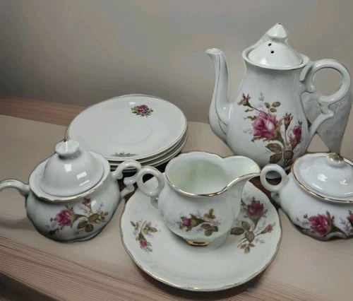 Vintage Pink Rose Porcelain Tea Coffee Set Gold Trim Creamer Sugar Pot Saucers