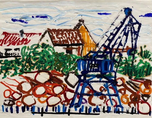 Expressionist Hans Lerch 60s Blue Crane in front of Houses and Landscape Tempera
