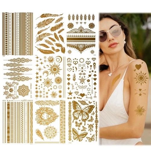 9 Sheets Gold Temporary Tattoos Stickers, Adhesive Glitter Tattoo Face