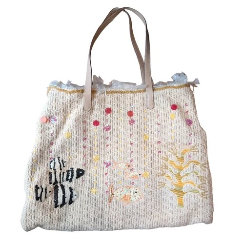 The Sak Ocean Fish Beaded Plastic Fringe Trim Woven Tote Stain Art To Wear