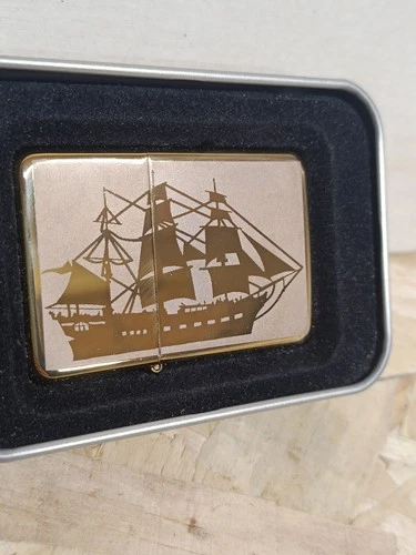 Golden Engraved Petrol Lighter With Boat Themed Engraving