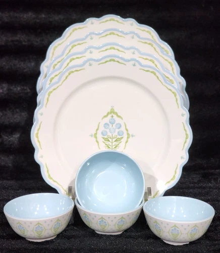 8pc Lillian August Blue Green Floral 4 Melamine Dinner Plates 4 Dip Bowls French