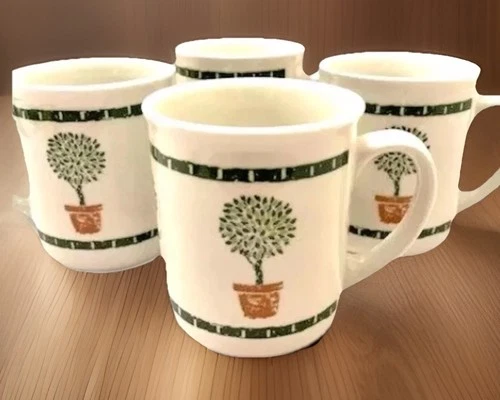 VTG Coffee Cup Mug Set 4 Retro Topiary Tree Kitsch 1990 Garden Party Boho Green