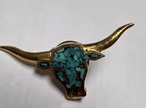 Vintage Western Tie Tack Gold Tone Longhorn Steer With Crushed Turquoise Inlay