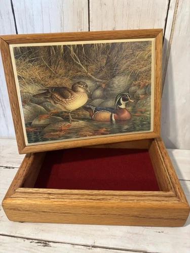 Wooden Trinket Box W/Ducks Art Tile By John Wilson Red Velvet Lined Lidded