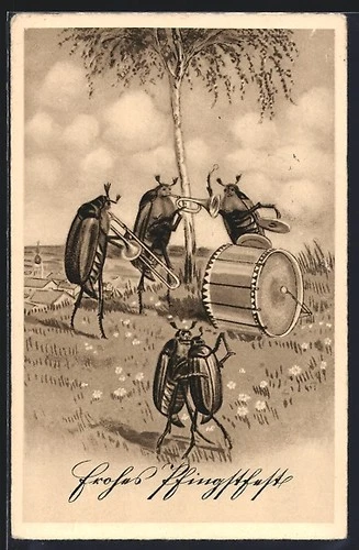 Postcard May Beetle dancing with trombones and timpani, Pentecost greeting 1938