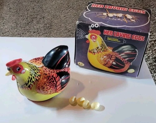VINTAGE HEN LAYING EGGS BATTERY OPERATED TIN TOY W/ ORIGINAL BOX & 3 EGGS