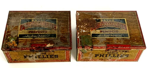2 Bayuk Philadelphia Phillies Perfecto Tin Cigar Tobacco Box Metal Vintage VTG