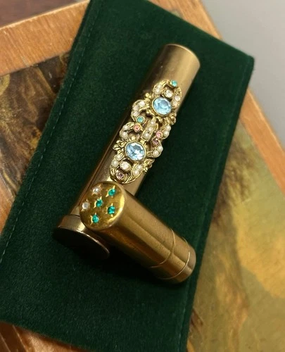 Vintage Rhinestoned Gold-Tone Travel Sized Set: 3” Toothbrush & 2” Tube Brush
